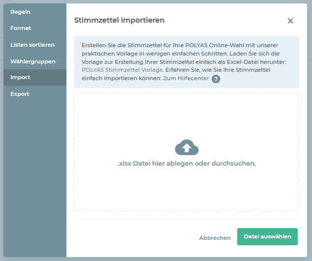 Die fertigen Stimmzettel können Sie anschließend einfach per Drag & Drop in das Modalfenster ziehen und somit in den Online-Wahlmanager hochladen. Klicken zum Abschluss auf „Speichern“.