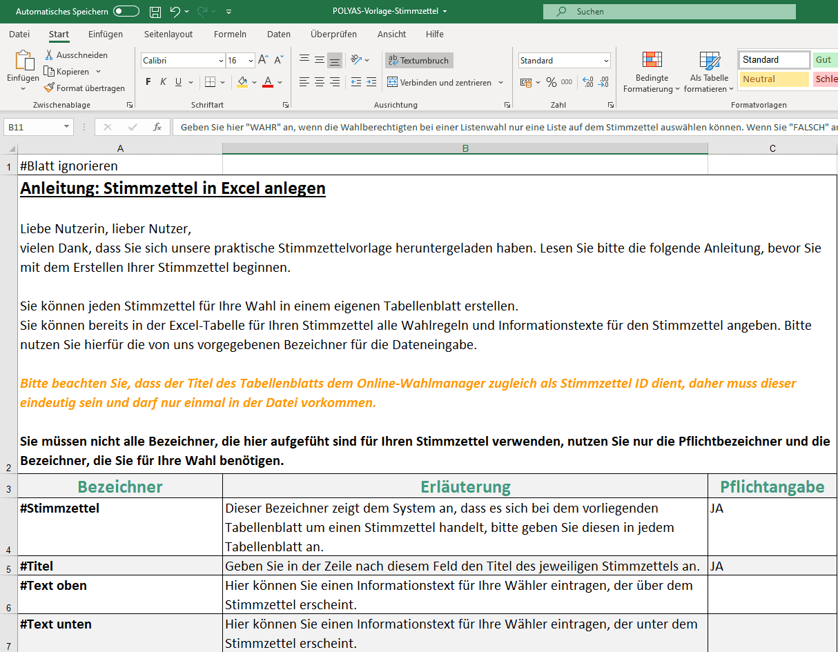 - #Stimmzettel: Jedes Tabellenblatt muss in Spalte 1 den Bezeichner #Stimmzettel haben. Alles, was sich unterhalb dieses Bezeichners im Sheet befindet, erkennt der POLYAS Online-Wahlmanager als Stimmzettel.