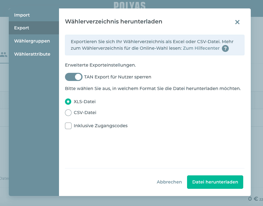 Nach der Wahl haben Sie die Möglichkeit, das Wählerverzeichnis im Excel- oder CSV-Format herunterzuladen. Das Verzeichnis enhält Informationen darüber, wer seine Stimme abgegeben hat und wer nicht. Um das Wählerverzeichnis herunterzuladen, klicken Sie im Tab “Wahlberechtigte” auf das Rad links oben über dem Wählerverzeichnis. Klicken Sie anschließend auf “Exportieren”.