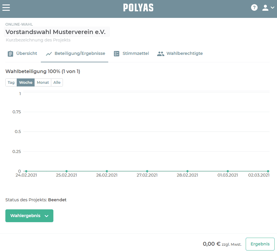 Nachdem Ihre Wahl beendet ist, wird die digitale Wahlurne automatisch ausgezählt. Um das Ergebnis zu erhalten, klicken Sie im Online-Wahlmanager auf den Reiter „Beteiligung/Ergebnis“. Unterhalb der Grafik zur Wahlbeteiligung finden Sie den Button „Wahlergebnis“.
