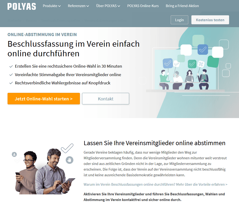 Mit über 25 Jahren Expertise für digitale Abstimmungen ist der B2B-Software-Anbieter POLYAS Vorreiter für sichere Online-Wahlen für Vereine, Verbände und andere Organisationen. Egal ob Live Votings, Online-Nominierungen oder die klassische Online-Wahl – jährlich setzen hunderte Vereine und Verbände ihre demokratischen Entscheidungen digital mit POLYAS um. Der erste Anlaufpunkt ist dabei oftmals unsere Website, auf der wir nützliche Informationen rund um die Durchführung und Organisation von branchenspezifischen Wahlen und Abstimmungen bieten.