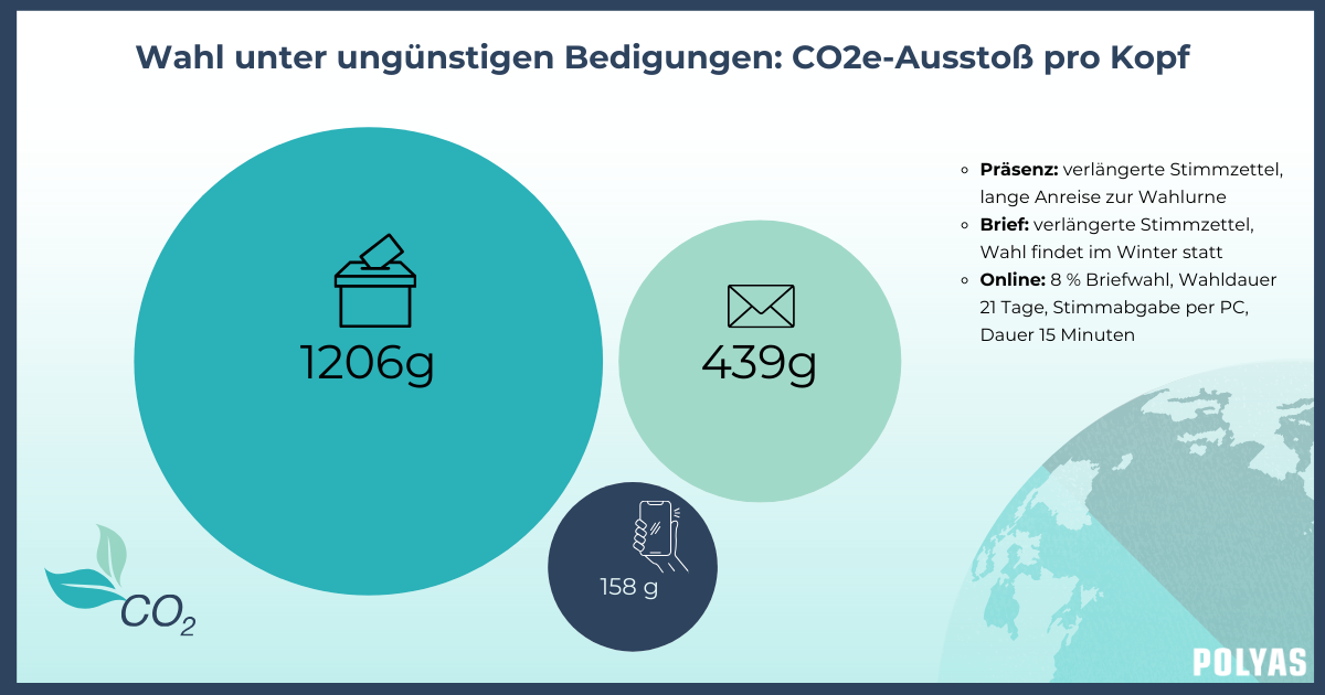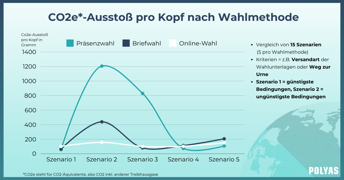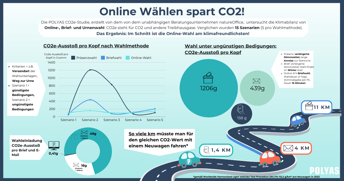 Die Nachhaltigkeitsstudie zeigt: Online-Wahlen liegen an der Spitze, wenn es um den geringsten ökologischen Fußabdruck der verschiedenen Wahlmethoden geht. Anhand verschiedenster Berechnungen zeigt die Co2e-Studie, dass Online-Wahlen mit 100 – 156 g CO2e (CO2-Äquivalente) pro Wähler:in im Durchschnitt die umweltfreundlichste Wahlmethode sind. Für die Studie hat Nature Office Online-, Präsenz- und Briefwahlen in 15 Szenarien verglichen und eine CO2e-Bilanzierung gemäß international anerkannter Kriterien vorgenommen.