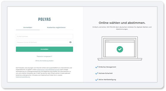 Registrieren Sie sich kostenlos im POLYAS Online-Wahlmanager, um Ihre Vereinswahl online durchzuführen. Mit POLYAS können Sie Stimmzettel erstellen, die Sie digital an Ihre Vereinsmitglieder senden. Die Kosten für die Durchführung Ihrer Online-Wahl sind abhängig von der Anzahl Ihrer Wahlberechtigten. Den Preisrechner finden Sie hier.