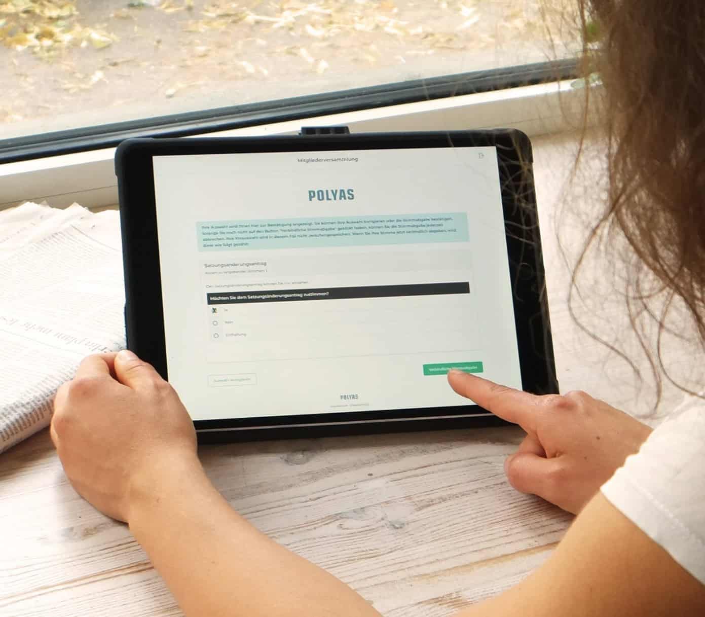 Ihre Stimmberechtigten können bei einem POLYAS Live Voting per Live Stream zur Sitzung dazugeholt werden. Einige Mitglieder stimmen vor Ort ab, andere von zu Hause aus. Hier erfahren Sie mehr über hybride Events!