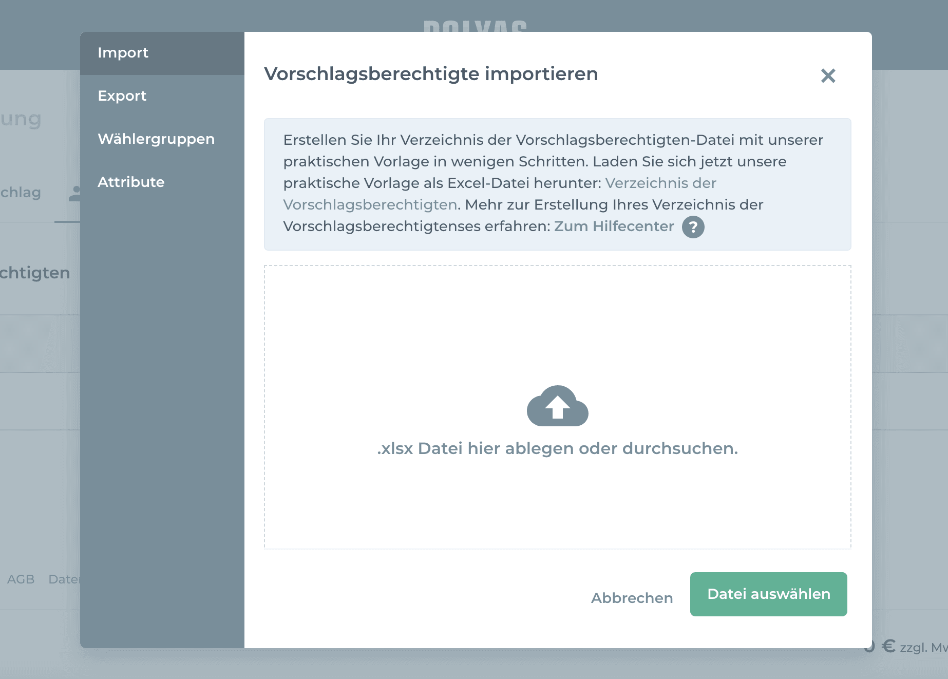 Insbesondere bei sehr vielen Nominierungsberechtigten bietet es sich an, die Liste der Vorschlagsberechtigten hochzuladen. Klicken Sie auf das Zahnrad-Symbol und dann auf „Import“. Hier finden Sie unsere praktische Excel-Vorlage, mit der Sie Ihr Verzeichnis im Handumdrehen einrichten. Sie entscheiden, welche Attribute der Nominierenden im Verzeichnis zu sehen sein sollen.
