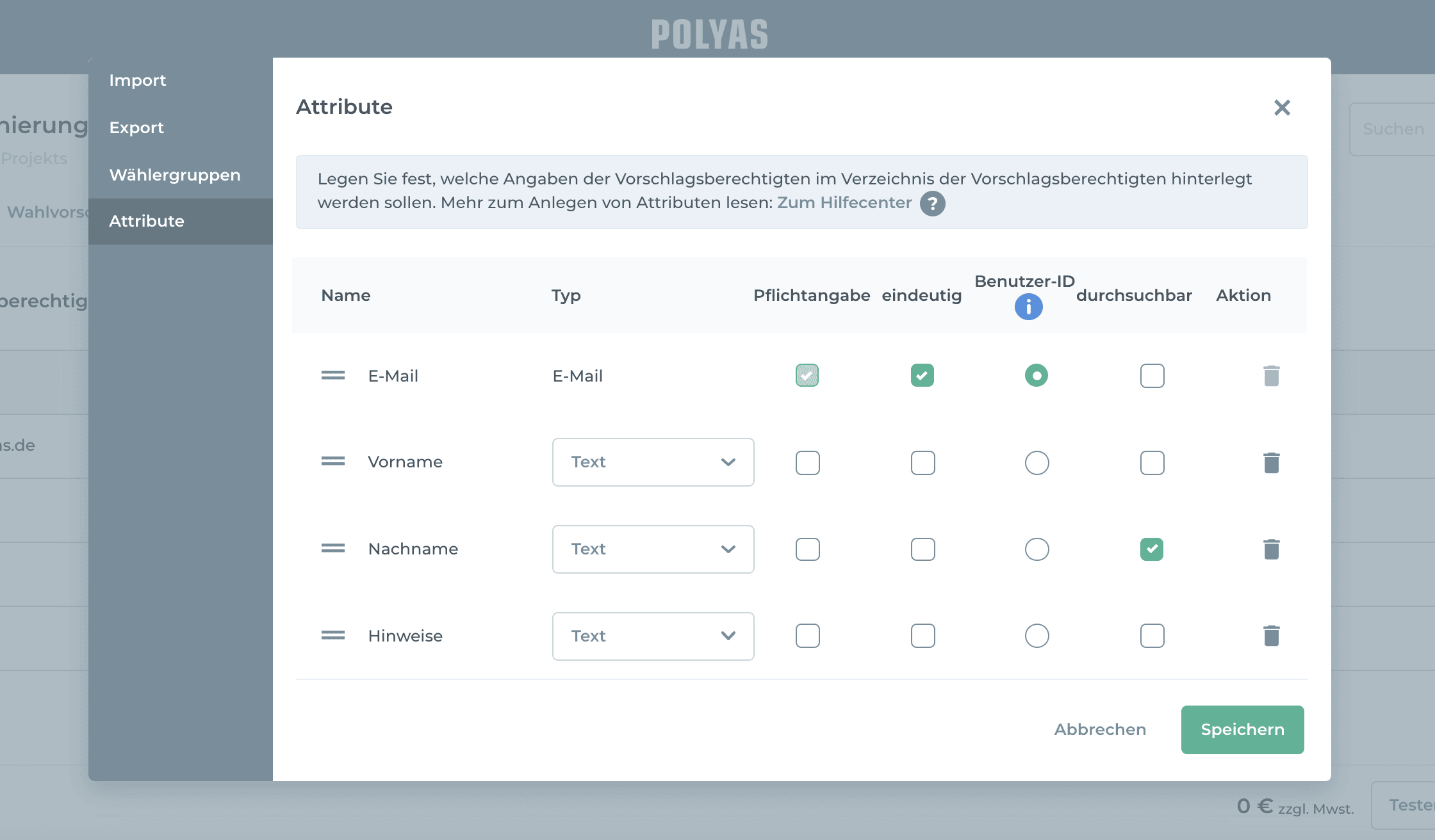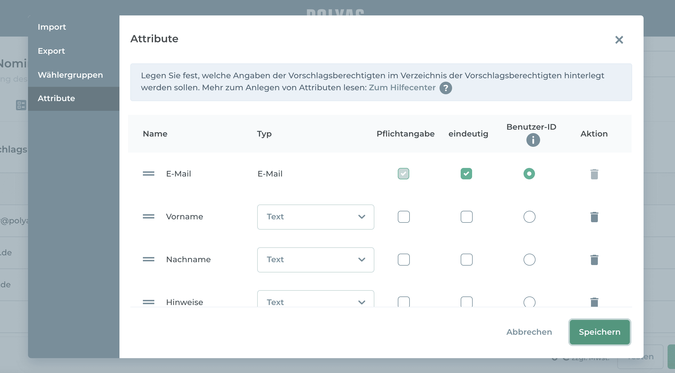 Fürs manuelle Einrichten genügt es, wenn Sie die E-Mail-Adressen der Nominierungsberechtigten in die dafür vorgesehenen Felder eintragen. Mit einem Klick auf das Zahnrad-Symbol und einem weiteren auf „Attribute“ können Sie Ihrer Liste weitere Spalten hinzufügen, z. B. Vor- und Nachname der Vorschlagsberechtigten oder eine Mitgliedsnummer.