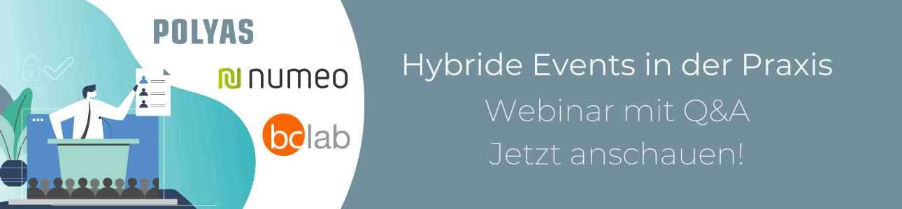 Das Veranstaltungsformat der Zukunft sind hybride Events. Dazu haben wir vor kurzem ein Einführungs-Webinar durchgeführt, das sich auf die drei Schritte zur Umsetzung einer hybriden Veranstaltung fokussiert hat. Mit diesem Webinar der Serie (Aufzeichnung weiter unten anschauen) tauchen wir tiefer in das Thema ein und verleihen dem Baukasten-System für hybride Events mehr Leben. Gemeinsam mit unseren starken Partnern bc.lab (Social Listening Anbieter) und numeo (Software- und IT-Lösungen für Events) zeigen wir anhand von praktischen Beispielen auf, wie Sie Ihre Veranstaltung bestmöglich umsetzen.